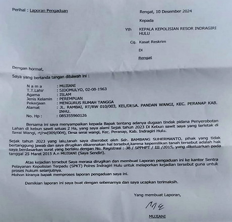 Pengaduan resmi tersebut telah diterima oleh Sentra Pelayanan Kepolisian Terpadu (SPKT) Polres Indragiri Hulu. Mujiani berharap agar pihak kepolisian dapat segera menindaklanjuti laporan ini untuk mendapatkan keadilan atas hak miliknya yang diduga kuat telah dirampas oleh Bambang Suhermanto.