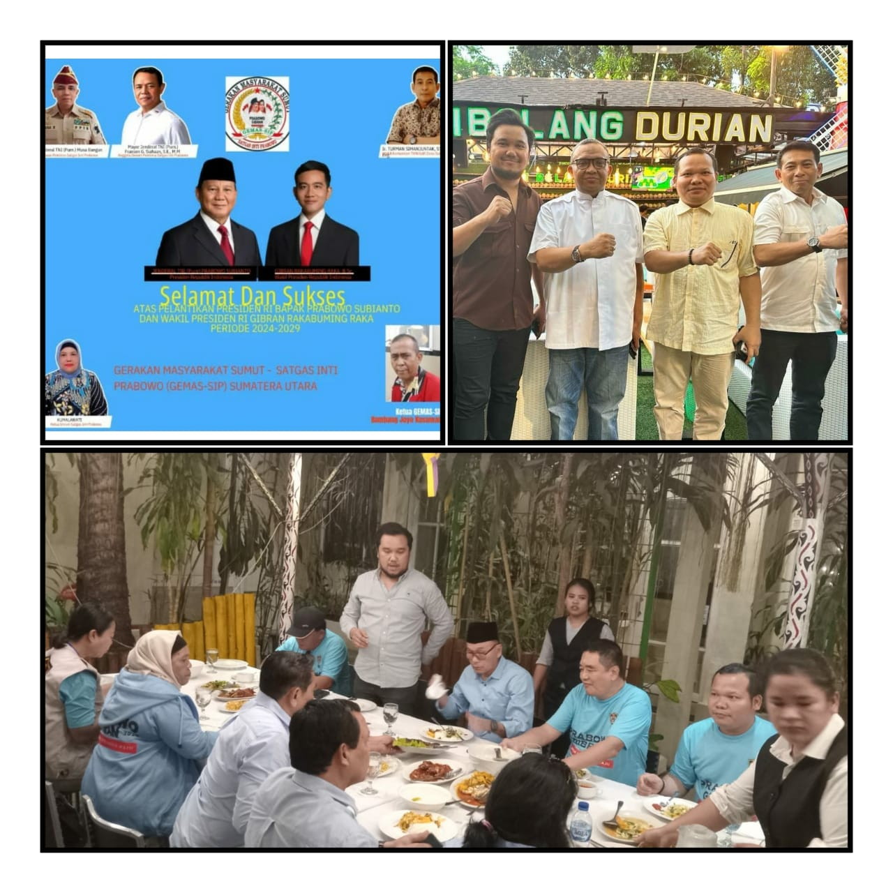 Kami Keluarga Besar Gerakan Masyarakat Sumut-Satgas Inti Prabowo (GEMAS-SIP) Sumatera Utara mengucapkan selamat kepada bapak H.Prabowo Subianto dan bapak Gibran Rakabuming Raka sebagai Presiden dan Wakil Presiden Republik Indonesia. “Harapan kami semoga bisa menjalankan amanah Rakyat dengan sebaik-baiknya dan bisa membawa kesejahteraan serta kemakmuran bagi seluruh Rakyat Indonesia, Ucap ketua GEMAS-SIP.