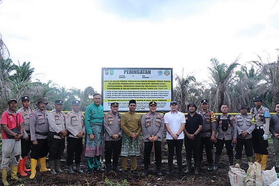 ROKAN HILIR – Kapolres Rokan Hilir AKBP Isa Imam Syahroni bersama Wakil Bupati Rokan Hilir Jhonny Charles memasang plang larangan beraktivitas di lahan bekas kebakaran hutan dan lahan (karhutla) di Kecamatan Bangko, Kabupaten Rokan Hilir, Senin (29/8/2025).