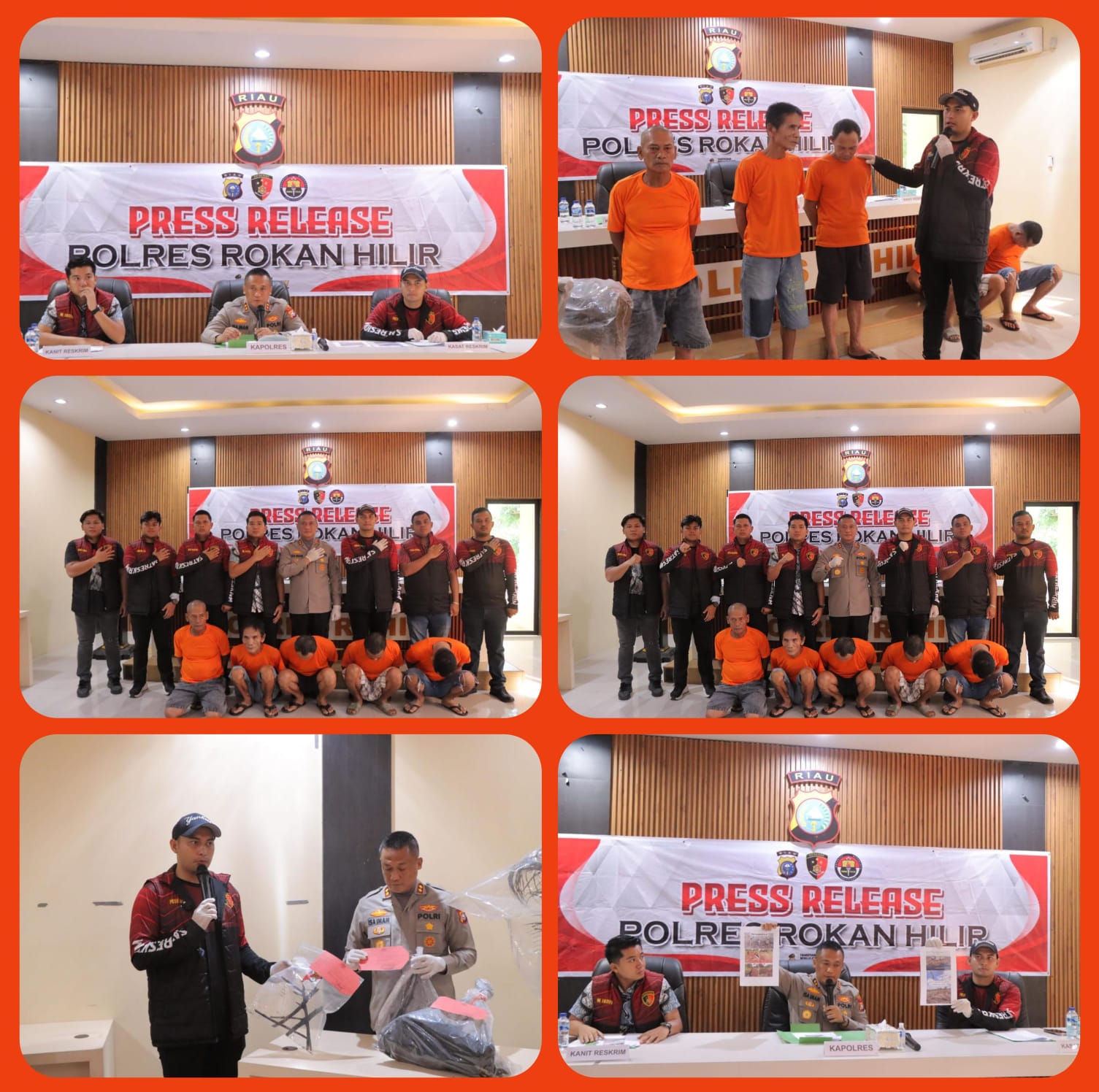Kapolres Rohil AKBP Isa Imam Syahroni, S.I.K M.H, didampingi Kasat Reskrim Rohil, AKP I Putu Adi Juniwinata, S.Tr.K.,S.I.K. Kanit II Sat Reskrim Polres Rokan Hilir Ipda Ivan Bayu Aji Maulana, S.Tr.K. dan Kasi Humas Polres Rokan Hilir Ipda Darlinson Sitorus SH dan anggota Sat Reskrim Polres Rohil, menyampaikan identitas para pelaku dan tindak pidana yang dilakukan oleh 5 Tersangka yang dihadirkan kepada sejumlah awak media.