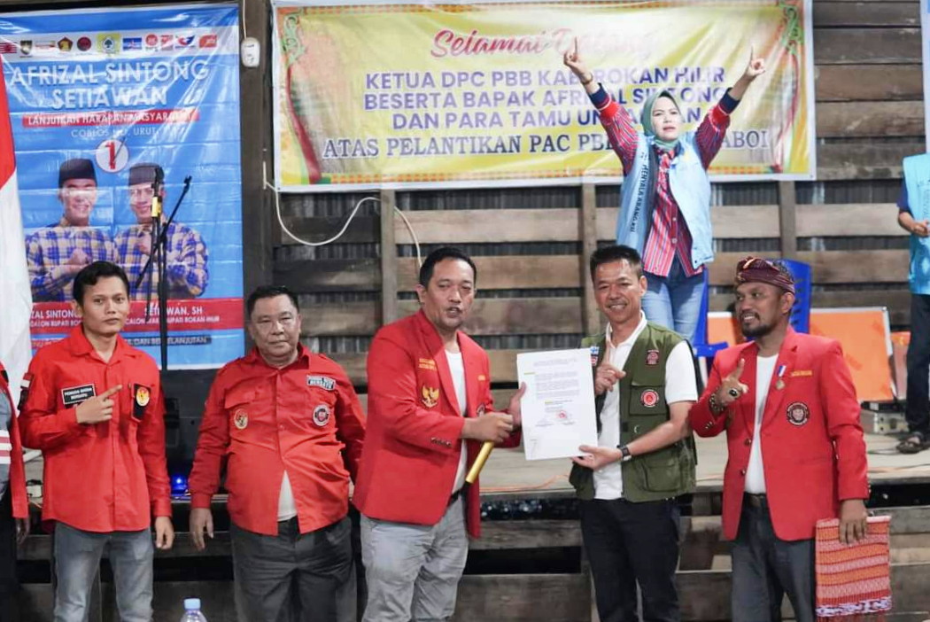 SK dukungan tersebut, diserahkan langsung oleh Ketua DPC PBB Kabupaten Rokan Hilir Edward Manihuruk saat Afrizal Sintong menghadiri Pelantikan PAC PPB Kecamatan Sinaboi sekaligus melaksanakan kampanye dialogis di Kepenghuluan Sungai Bakau.