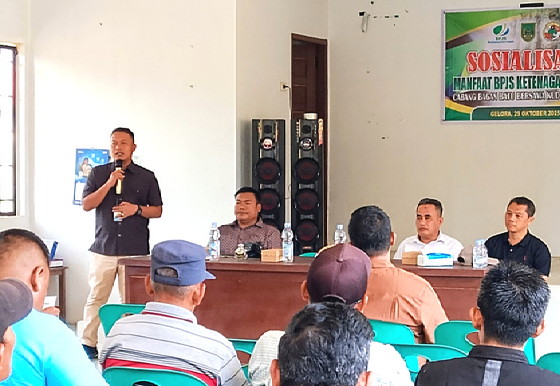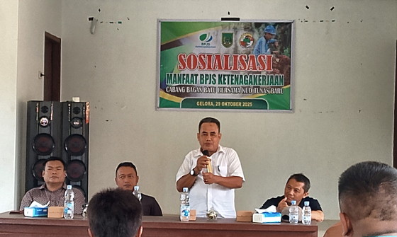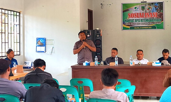 ROKAN HILIR, RIAU — Kepala Cabang BPJS Ketenagakerjaan Rokan Hilir, Rio Rahman, memimpin langsung kegiatan sosialisasi program jaminan sosial ketenagakerjaan di Balai Pertemuan Kepenghuluan Gelora, Kecamatan Bagan Sinembah, Rabu (29/10/2025).