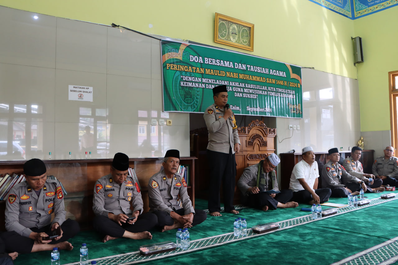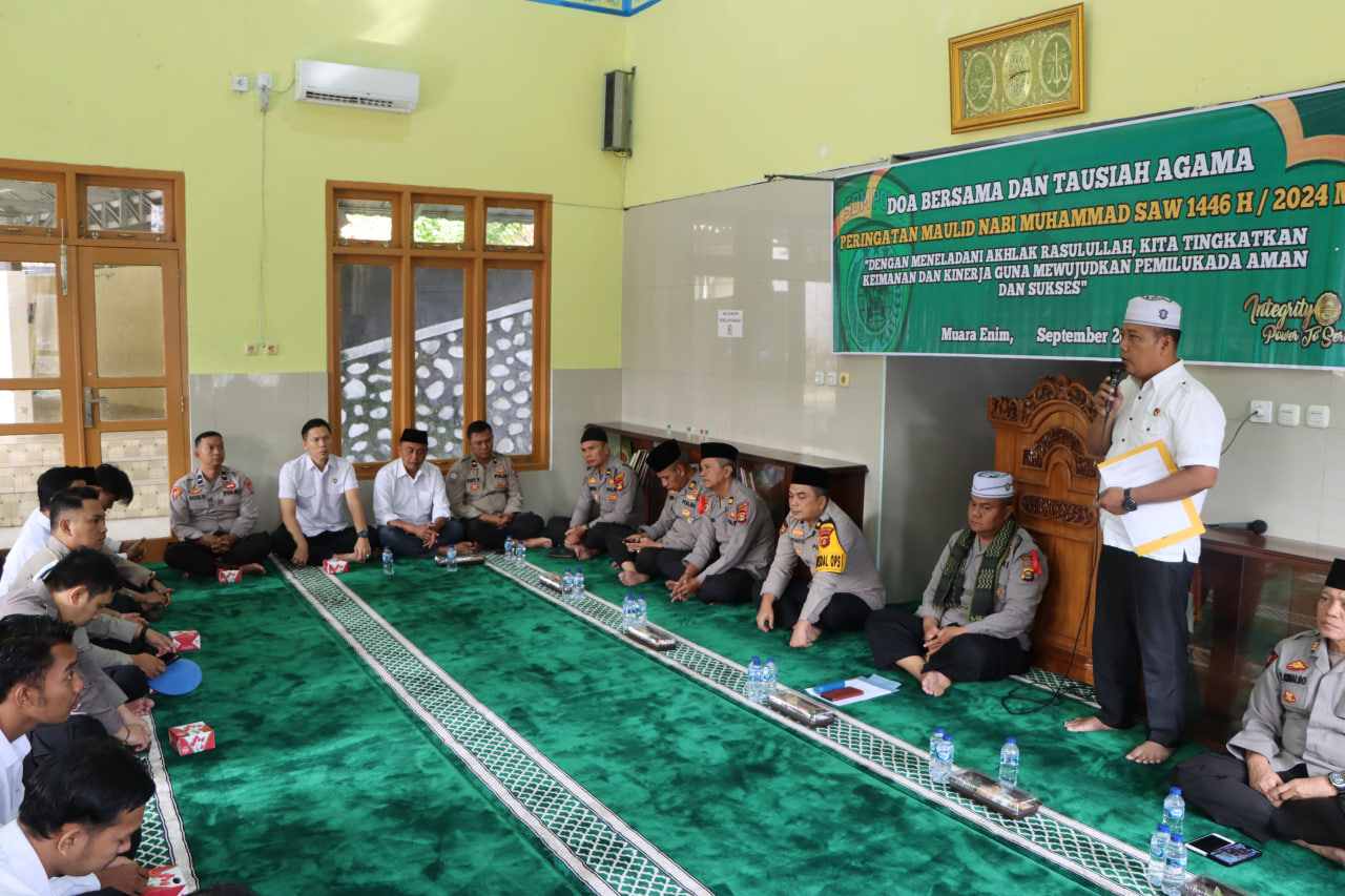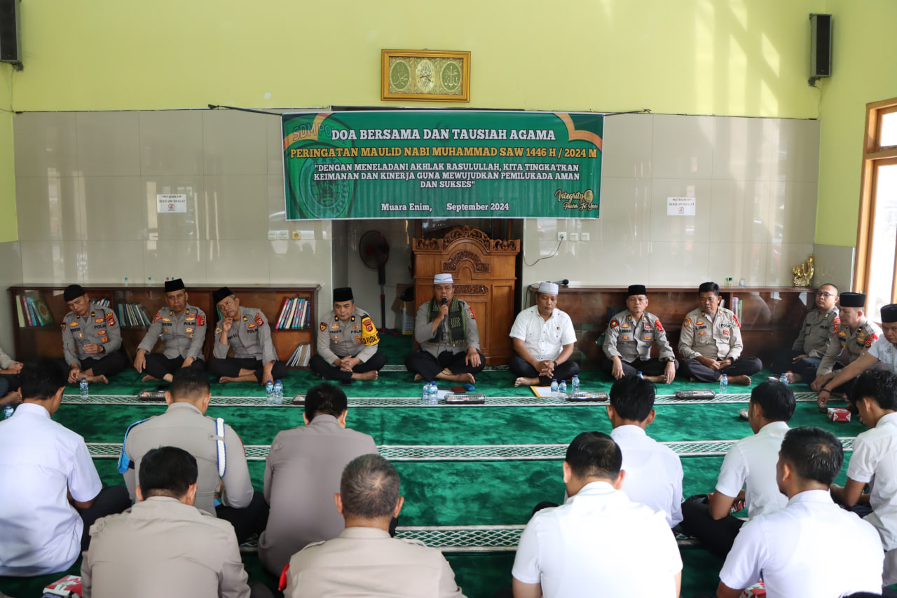 Muara Enim – Dalam rangka memperingati Maulid Nabi Muhammad SAW 1446 H/2024 M, Polres Muara Enim mengadakan acara penuh makna di Masjid Al-Hikmah Mapolres Muara Enim pada Rabu (18/09/2024). Acara ini mengangkat tema “Dengan meneladani akhlak Rasulullah, Kita tingkatkan keimanan dan kinerja guna mewujudkan Pemilukada Aman dan Sukses.” Kegiatan ini dihadiri oleh Kabag SDM Polres Muara Enim, Kompol Apriansyah, SH, MSi, Pejabat Utama, personel, dan ASN Polres Muara Enim.