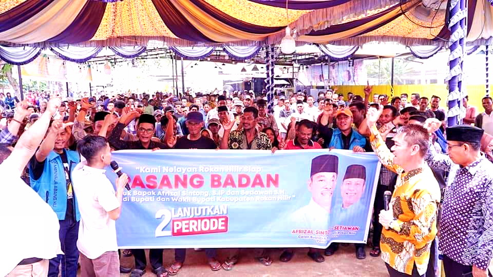 “Kami nelayan rokan hilir siap pasang badan, untuk bapak afrizal sintong dan bapak setiawan, menjadi bupati dan wakil bupati kabupaten rokan hilir lanjutkan dua periode. Aset menang, aset pasti menang, aset menang menang menang. “teriak ribuan nelayan tersebut.